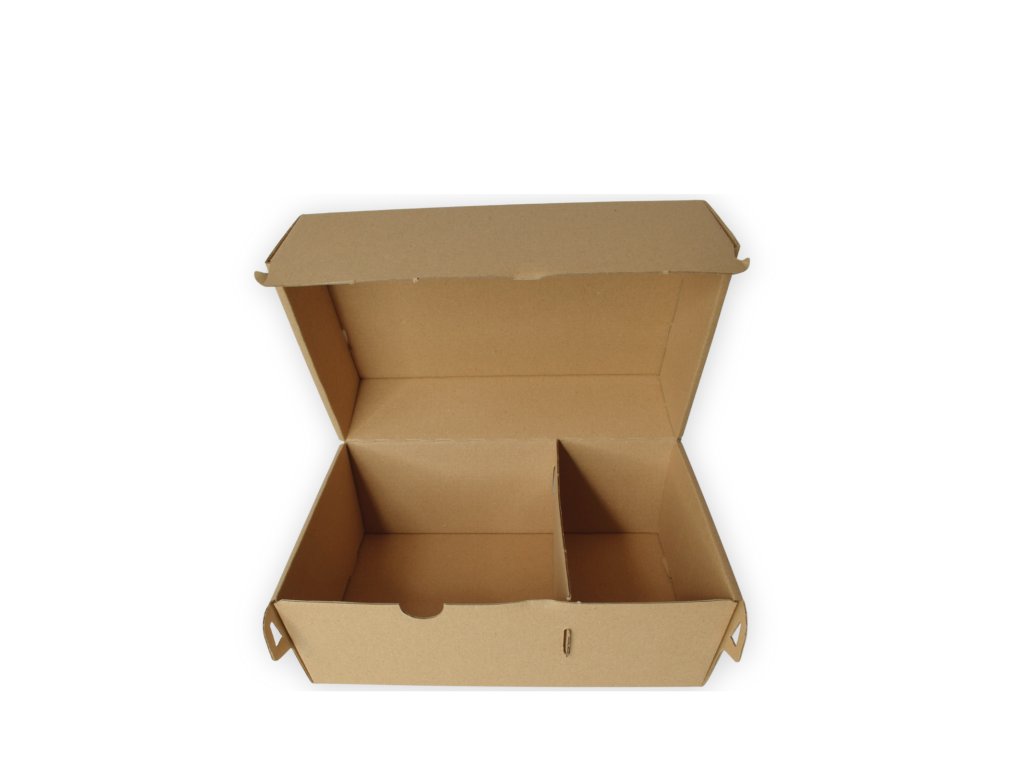Vyrobený z pevnej vlnitej lepenky, s extra priečinkom na hranolky alebo prílohu.