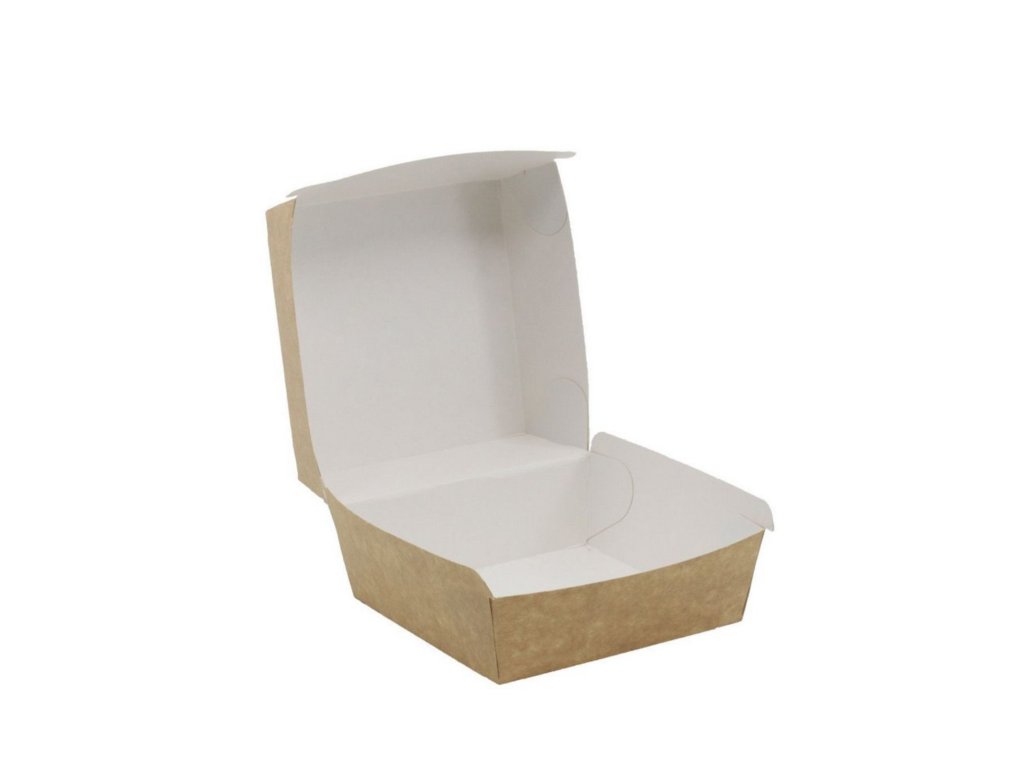 Táto krabička na burger XL je vyrobená z kvalitného CKB kartónu v prírodnej kraft farbe s čistým bielym nepremastiteľným vnútrom, ktoré chráni pred mastnotou a šetrí prírodu.