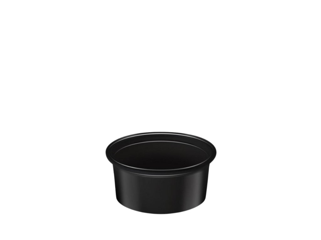 Táto čierna dressingová miska z polypropylénu (PP) s objemom 80 ml je ideálna na väčšie porcie omáčok, dipov, dressingov alebo menších príloh. Vďaka štandardnému priemeru 70 mm je kompatibilná s viečkom 7075.