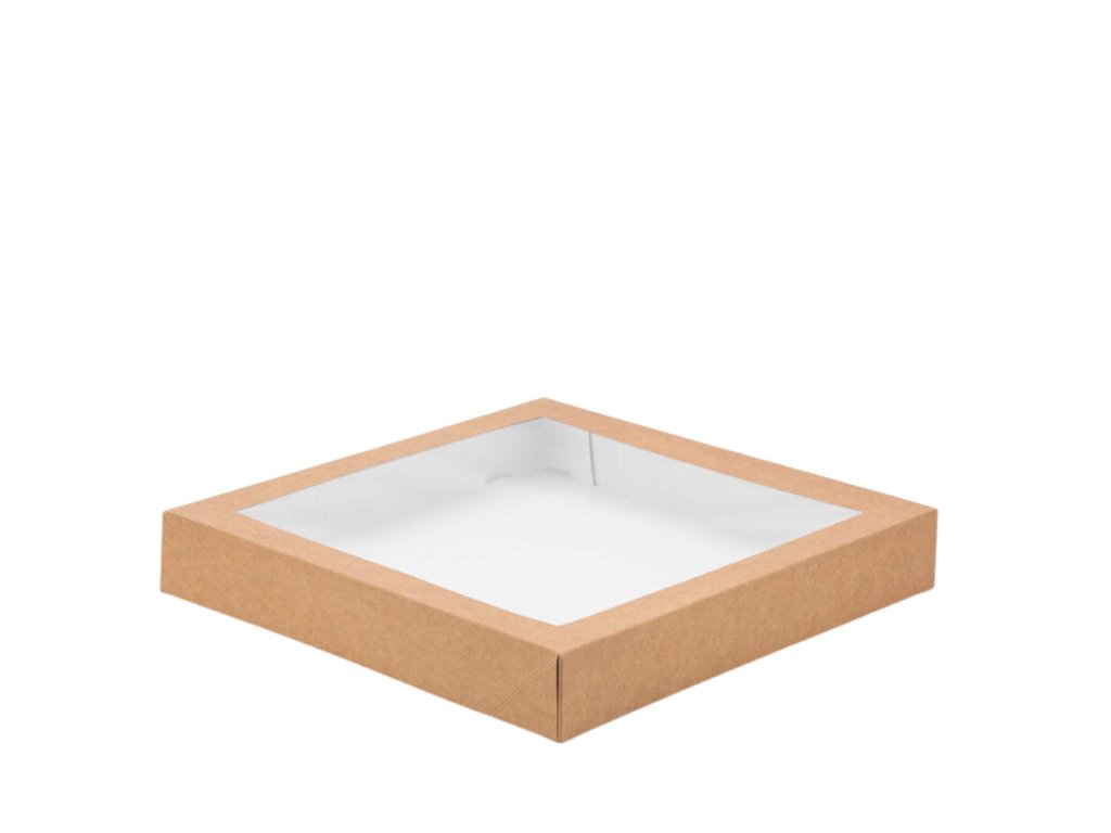 Štvorcový formát s väčšou plochou pre sushi, zákusky, koláče, sendviče alebo darčekové sety. Priehľadné okienko umožňuje dokonalú prezentáciu – ideálne na catering či predaj to-go.
