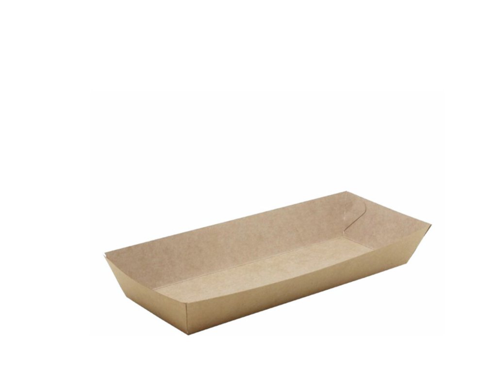 Táto papierová miska tray z kraft materiálu je ideálna na bagety, hot-dogy a ďalšie podlhovasté pochúťky. Ekologická a kompostovateľná, vhodná na priamu konzumáciu na mieste.Otvorený dizajn umožňuje jednoduchý prístup k jedlu, a navyše skvelo prezentuje obsah.